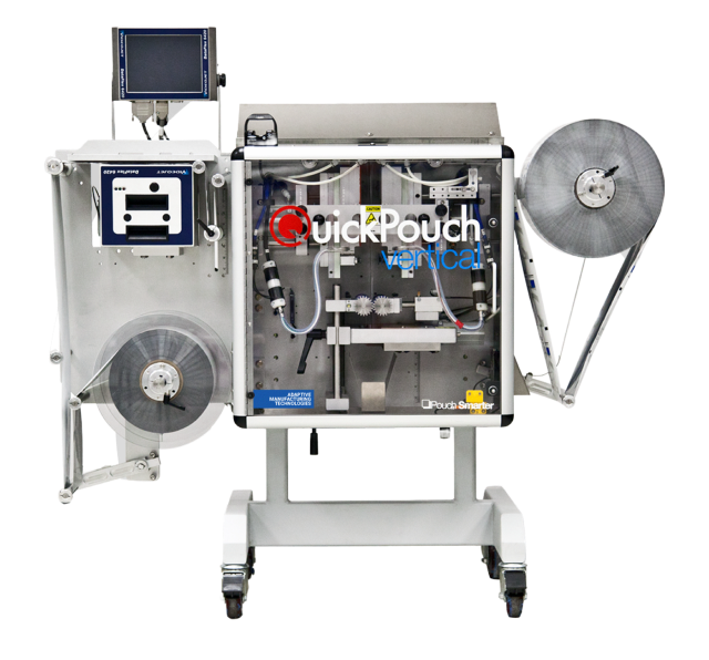 The QuickPouch Vertical is a compact, economical, customizable pouch form/fill/seal machine designed to fit almost any need. It is a cycle-on-demand system that uses a hot die to form pouches from rollstock, leaving the top of the pouch open for loading, and then sealing the pouch during the next cycle.